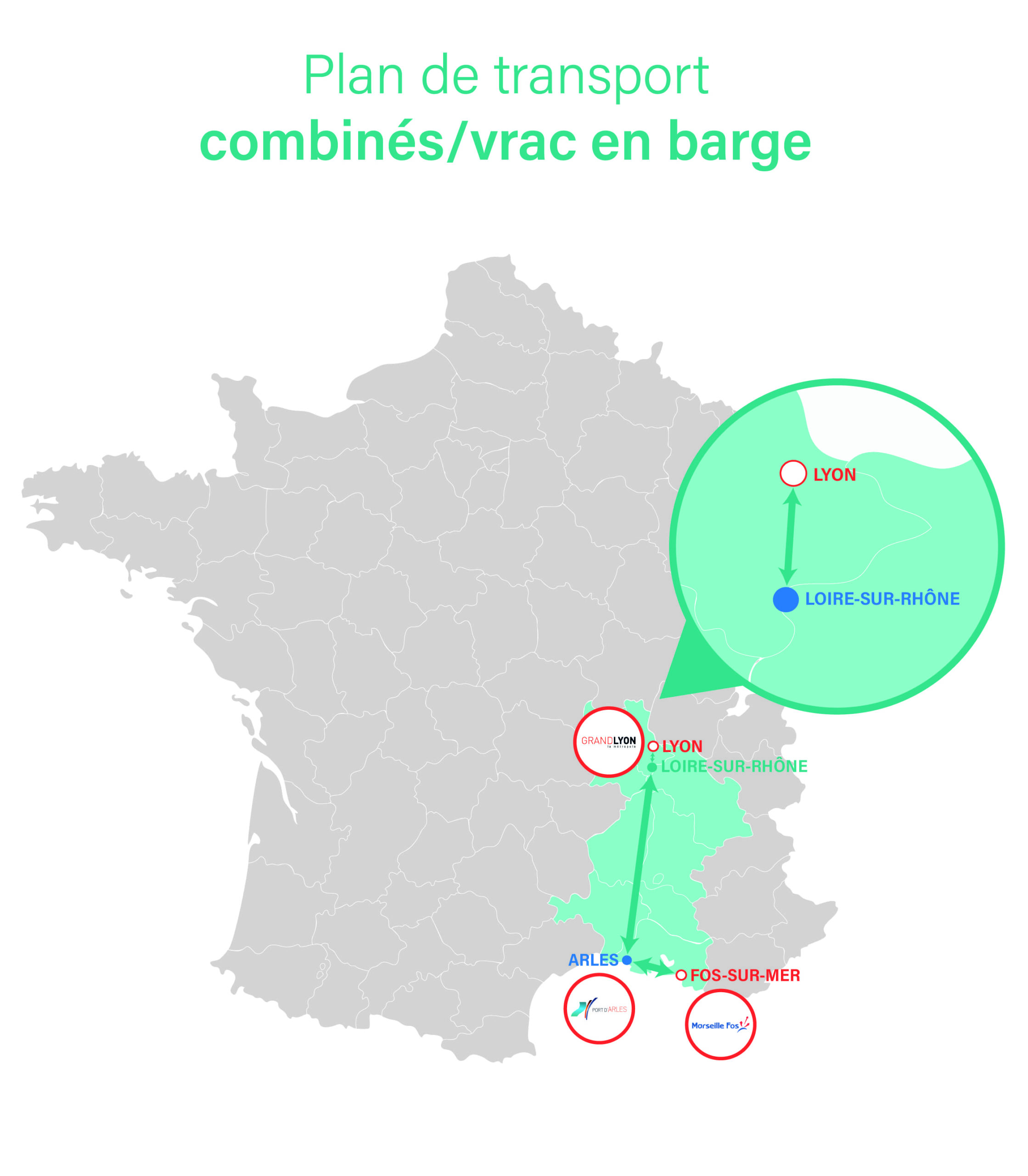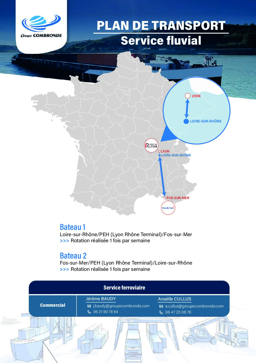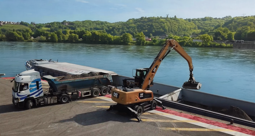 Nous assurons l’acheminement du mâchefer entre Lyon et Loire‑sur‑Rhône, tandis que nos barges transportent des conteneurs maritimes entre Fos‑sur‑Mer, Arles et Loire‑sur‑Rhône.
